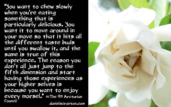 當你品嘗美味時,你想慢慢咀嚼。你想讓它在你的口中四處移動,這樣就可以觸發所有的味蕾,直到你吞下它,這種體驗也是如此。為什麼你們不直接跳到第五維度,開始體驗更高的自我,是因為你們想享受每一點。你想享受這一切。在地球上你們不可能只是一個大躍進,跳過一路上所有的好東西。