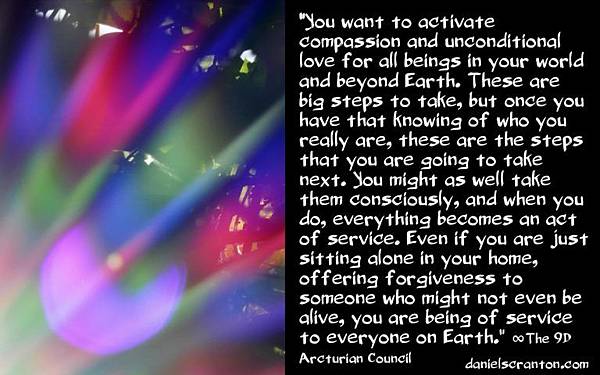 然後你想活化對你世界和地球上所有存有的慈悲和無條件的愛。這些都是很重要的步驟,但是一旦你知道自己到底是誰,這些就是你接下來要採取的步驟。你不妨有意識地接受它們,當你這樣做時,一切都變成了服務行為。即使你只是獨自一人坐在家裡,向一個甚至不在世上的人提供寬恕,這也是可以為地球上的每個人服務。你就是在引領道路。這是您正在展現它是如何完成的。