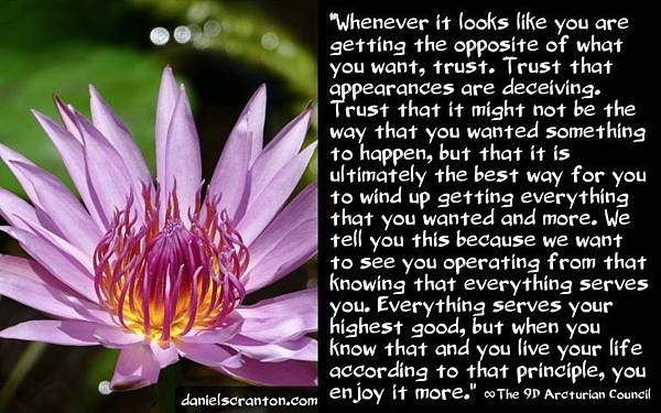 雖然最終的結果,不是按照你所要求的方式,但是請相信宇宙一切都是為你服務的情況下運作。一切都是為了你的最高利益,但是當你知道並按照這個原則過你的生活時,你會更享受它。你更開放,更少阻礙(less resistant),順其自然。你所需要做的是臣服、信任、與宇宙共同創造。