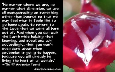 因此,每個人都將受益於安靜地坐著,閉上雙眼,並感覺到源頭能量作為我們所有人中存在的神性火花而受益。無論身在何處,無論在哪一維度,我們都在偽裝成源頭以外的東西,以便我們能感覺到再次”回家”,回到我們都出生的愛的感覺。而且當你們可以在擁有已知知識的情況下在地球上行走人間,並據此說話並採取行動時,你們甚至都不在乎何時會發生揚升,因為你們已經過了世界上最好的生活。
