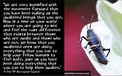 我們對你們作為覺醒的生命所取得的進步感到非常滿意。現在是你們的世界上的一個時刻,你們將看到並感受到覺醒者和未清醒者之間存在的巨大差異。我們知道,被喚醒的人們正在盡一切可能幫助同胞感到安全,就像你們一直在盡力幫助他們喚醒自己一樣。