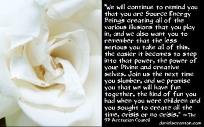 我們將繼續提醒你們,你們是源頭能量的存有,創造了你們在其中扮演的所有各種幻象的角色,並且我們還希望你們記住,你們對所有這些想法的越不嚴肅與執著,越容易掌握這種力量(step into that power),神力和創造力的力量。下次你們沉睡入眠時加入我們,我們向你們保證,我們將在一起玩樂,這是你們小時候一直試圖創造無危機的樂趣感。