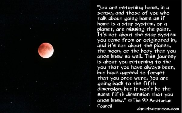You are returning home, in a sense, and those of you who talk about going home as if home is a star system, or a planet, are missing the point. It’s not about the star system you came from or originated in, and it’s not about the planet, the moon, or the body that you once knew so well. This journey is about you returning to the you that you have always been, but have agreed to forget that you once were. You are going back to the fifth dimension, but it won’t be the same fifth dimension that you once knew, and that is because of what you’ve been living there on Earth.